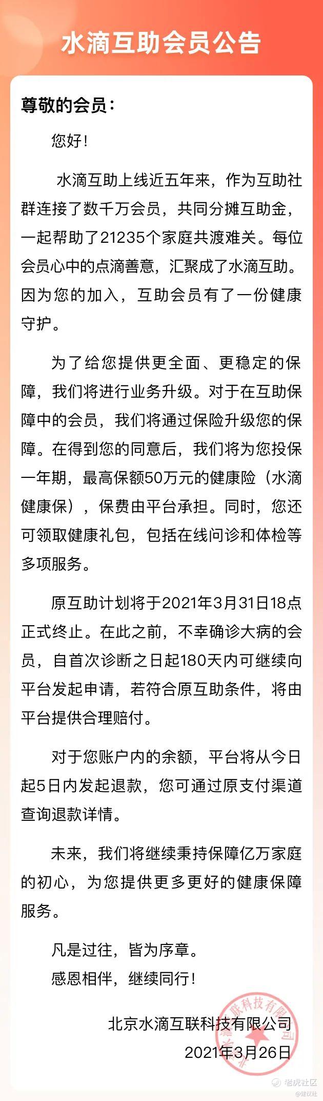 水滴互助发布公告时用了“升级”一词。这个词用得很聪明,“升级”和“关停”的不同就在于,“升级”对会员是有利的。网络互助会员的保障,和“一年期,最高保额50万的健康险”相比,显然是后者更有优势。