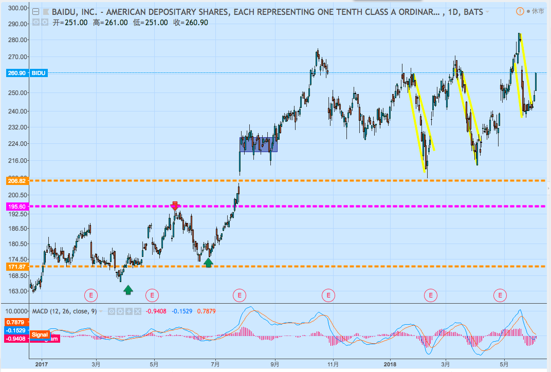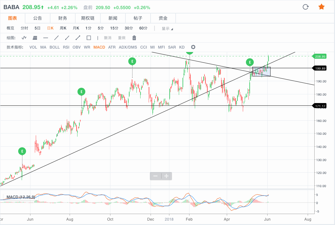 从日看来看,阿里在过去的一年中一直在盘整,阿里的支撑位在165-170,阻力位在190-200,本次股价突破了前高,能否守住这一趋势值得期待。从周k来看阿里处于上升趋势中,在上升趋势中,每次上涨都会突破前高,当股价触及趋势线时是很好地做多机会