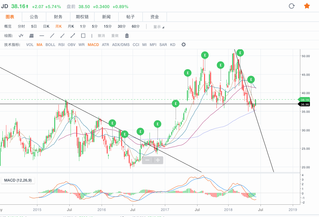 从日K来看,京东昨天股价上穿下降趋势线,是一个趋势反转的标志,不过这次突破未能带来巨大的交易量,警惕假性突破,当然如果能守住这一突破则是一次做多的好机会。另外从周k来看,股价图形为双顶,意味着如果股价未能在守住36.95的(颈线)支撑线,是一个可靠的卖出信号,因为下降趋势会持续一段时间,如果是空单的话,目标价25.7。