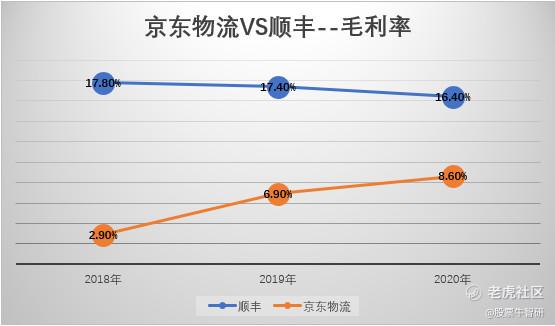 在从盈利能力上看,京东物流毛利率只有8.6%,顺丰高达16.35%;但近三年来,顺丰的毛利率呈现逐年下降趋势,而京东物流呈现逐年上升趋势。