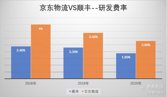 2020年京东物流研发费用为20.5亿元,同期顺丰为30亿,金额上似乎顺丰更胜一筹,但毕竟两者体量有一定差距,顺丰光从营收来看体量就是京东物流的2倍,这么比显然很不公平,我们更应该关注的是研发投入占营收的比重。