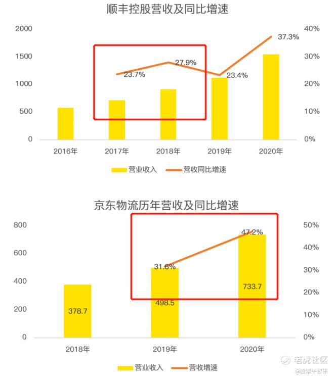 从2020年营收规模来看,顺丰为1540亿元,京东物流为734亿,顺丰几乎是京东物流的两倍,体量相差如此巨大,对比营收增速显然并不公平。我们再往前看几年,对比顺丰体量和京东物流相当时的营收的增速,京东物流有所领先。