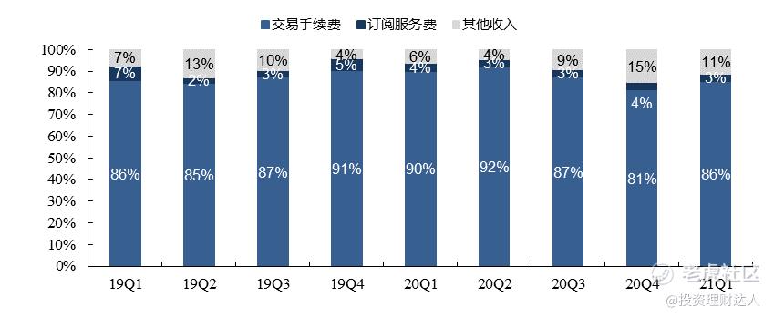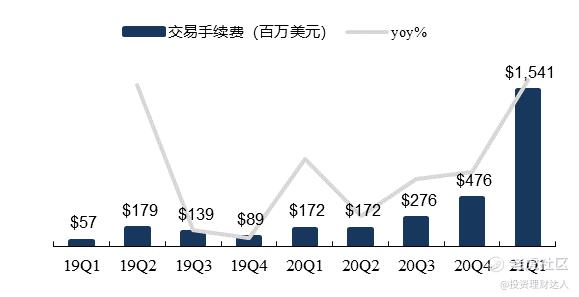 - 21Q1交易手续费业务营收为15.4亿美元(yoy+ %),占收入比 %(yoy+ %),主要系平台交易量激增