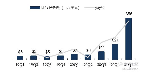 - 21Q1订阅服务费营收为5600万美元(yoy+173%),占收入比3%(yoy-25%),主要系机构客户数量上涨