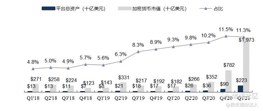 - 21Q1平台总资产为2230亿美元(yoy+144%)占机密货币总市值的11.3%