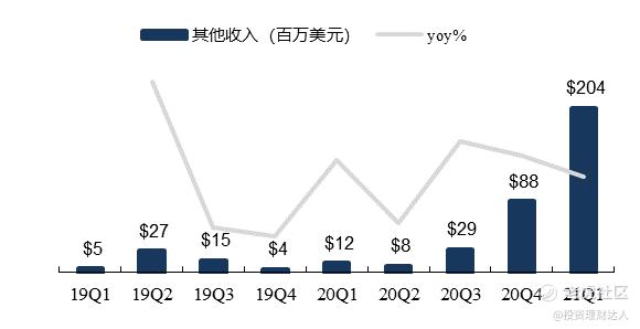 - 21Q1其他业务营收为2.04亿美元(yoy+132),占收入比11%(yoy-26%),占收入比环比下降主要系交易手续费激增