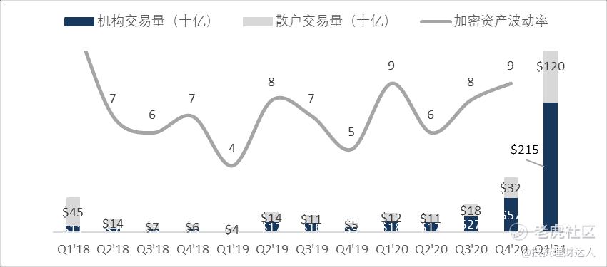 - 21Q1平台交易量为3350亿美元(+yoy276%),其中来自机构客户的交易量为2150亿美元,来自个人用户的交易量为1200亿美元