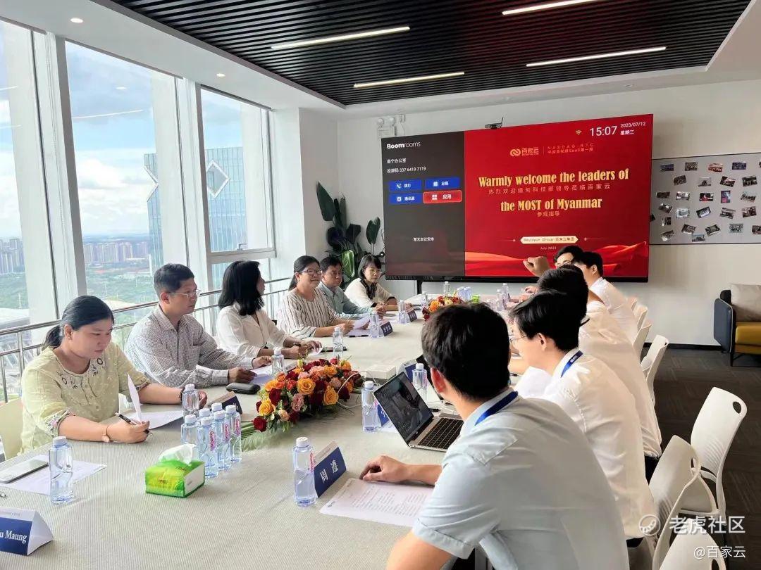 7月12日,缅甸科技部研究与创新司司长漂漂温、研究与创新司处长塔津汉和觉图蒙、研究与创新司副处长敏敏科和余余鸟乌、研究与创新司首席科学家凯蒂觉、以及山海云汇CEO 何艳莉一行人到百家云进行参观交流。