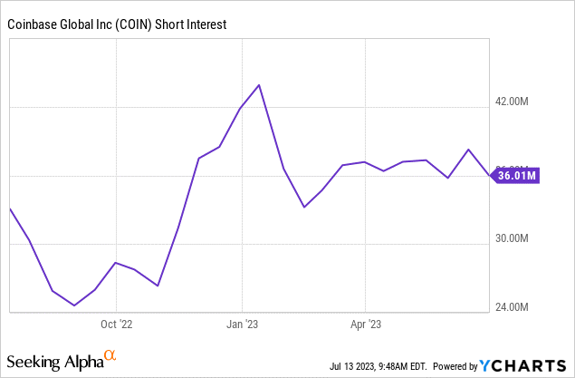 我们可以在上面看到 ARKK 最大持股之一 Coinbase Global的空头利息。空头兴趣在去年年底大幅上升,但在 2023 年稳步下降。