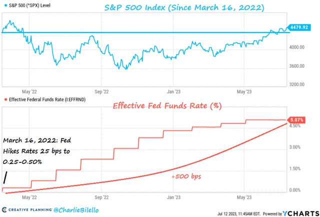 上图中,蓝色代表标准普尔 500 指数,它现在超过了 2022 年 3 月中旬以来的水平。在第二张红色图中,联邦基金的总变化为500 基点。