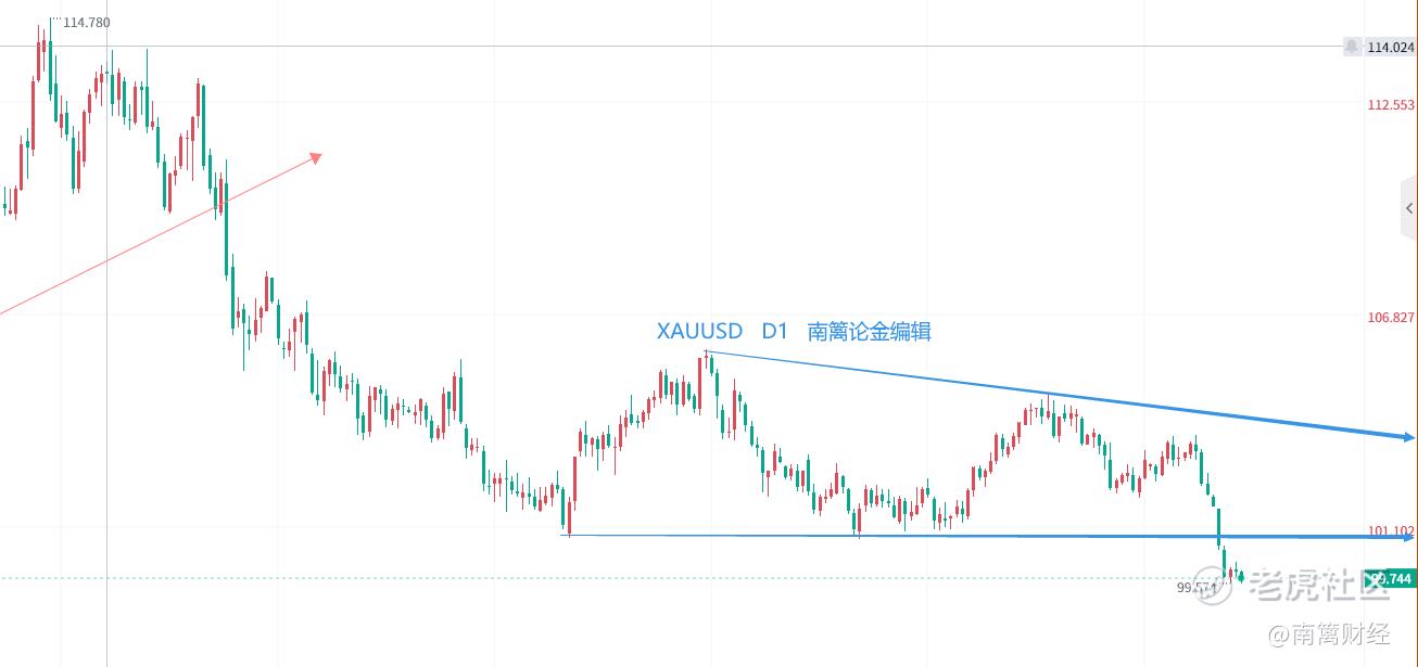 说着不讲数据的,但是还是叨叨两句,毕竟晚上的零售销售月率被称为“恐怖数据”。前值0.3%,预期值0.5%,这是一份书面利多美元利空黄金的数据。但是大概率,这个数据也不会把美元从泥潭里抽出来。美元自从跌落来了100.8之后,实际上日线的三角形破位经过测算,下一重支撑是在98—98.5左右,目前的震荡区间,并没有见底的信号。