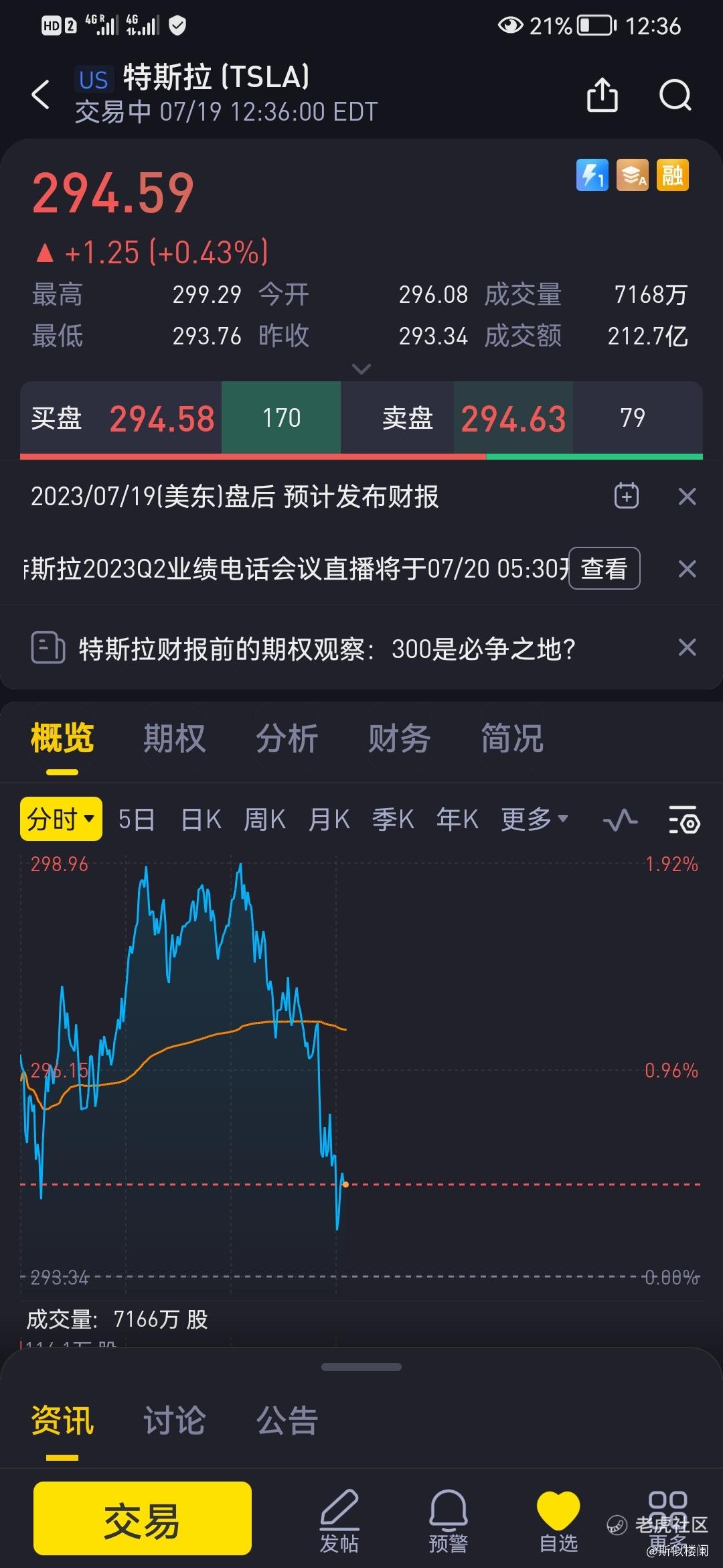 目前价位 294,摸高 299 回调,相较于不久前提出的 300 近在咫尺,也不知什么时候市场真开始把 300 认为是一个重要关卡啦并灌输到各大媒体上,从今日分时看,上方抛压确实够大,但借助于市场对财报的热情,这点抛压不算什么,一旦高开突破 300 关口整,当日高点可能是短期个把星期的高点,调整几日有望继续高看 320-330,理由是,在突破 300 会有个技术性回调确认前方 290 这个平台的支撑,以及在这个位置释放套牢盘解套并把抄底资金洗洗出来。过个把星期后能继续高看的理由在于市场在上涨空间已经形成,特斯拉代表的业绩风向标,更多的是市场信心,因此还有机会顺势每天 1 个点左右的蹭蹭往上日拱一卒模式。
