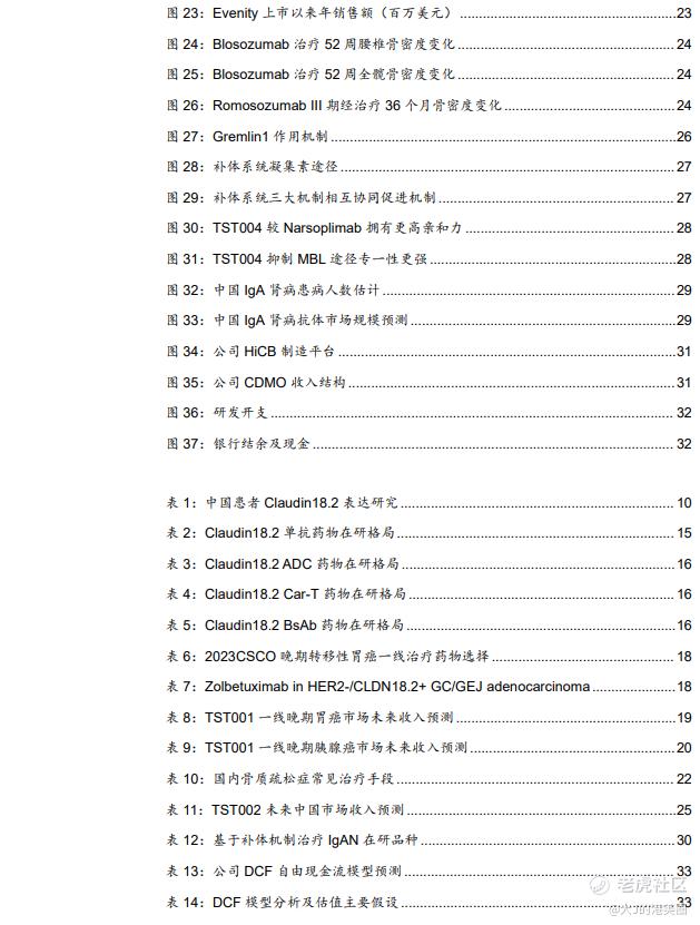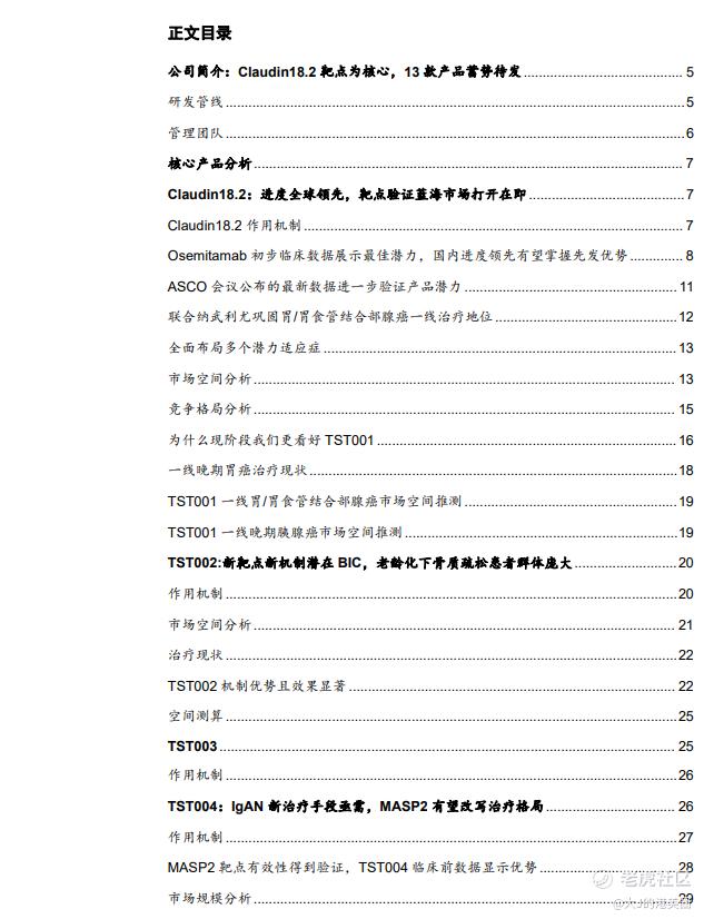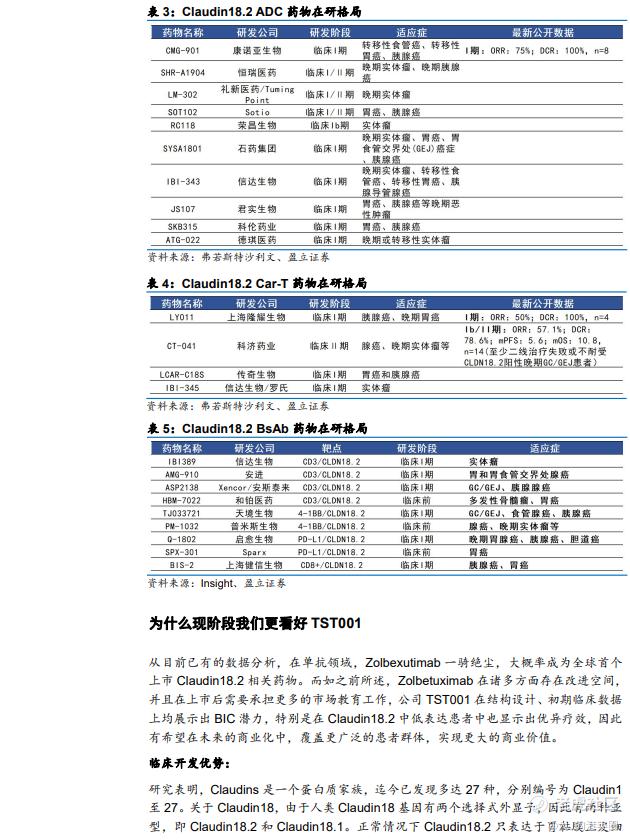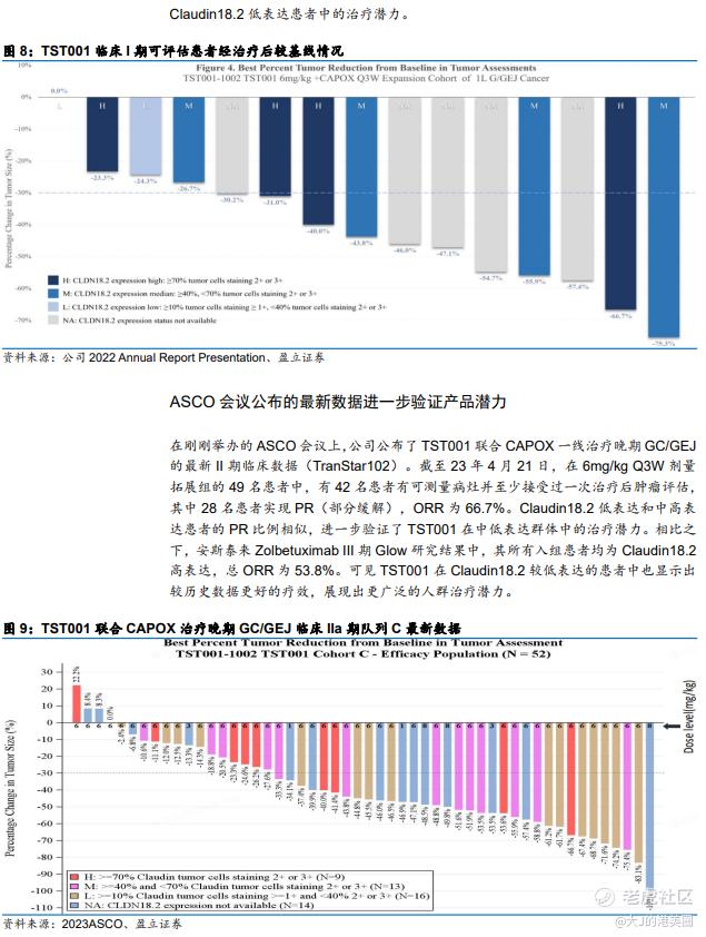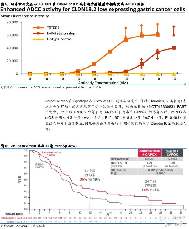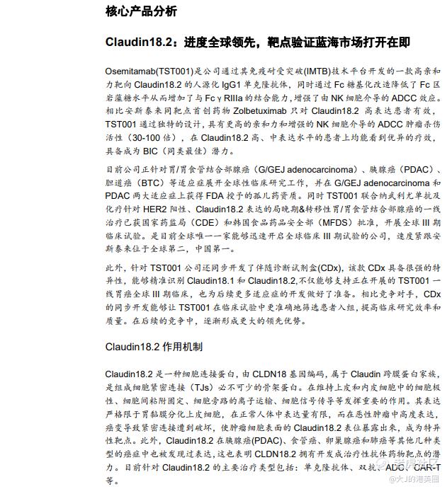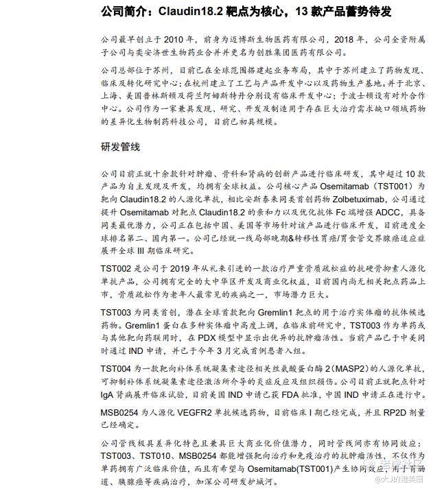 公司2单抗产品TST001临床进展顺利,于2023年ASCO和ESMO GI年会发布的最新数据显示出对Claudin18.2中、低表达患者依然有效,较同类首创药物Zolbetuximab展现出更大的治疗及商业潜力。目前TST001已获国家药品监督管理局及韩国食品药品安全部批准,就HER2阴性、Claudin18.2表达的一线局部晚期&转移性胃及胃食管结合部腺癌开展TST001联合纳武利尤单抗及化疗的全球III期临床,进度全球第二、国内第一。