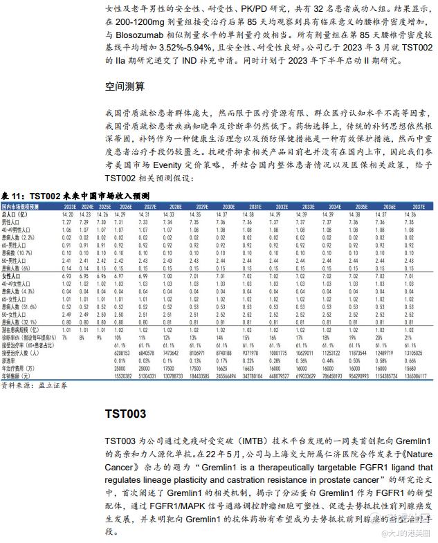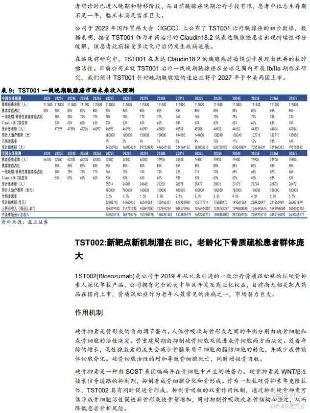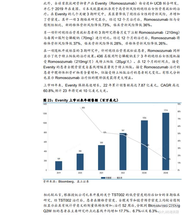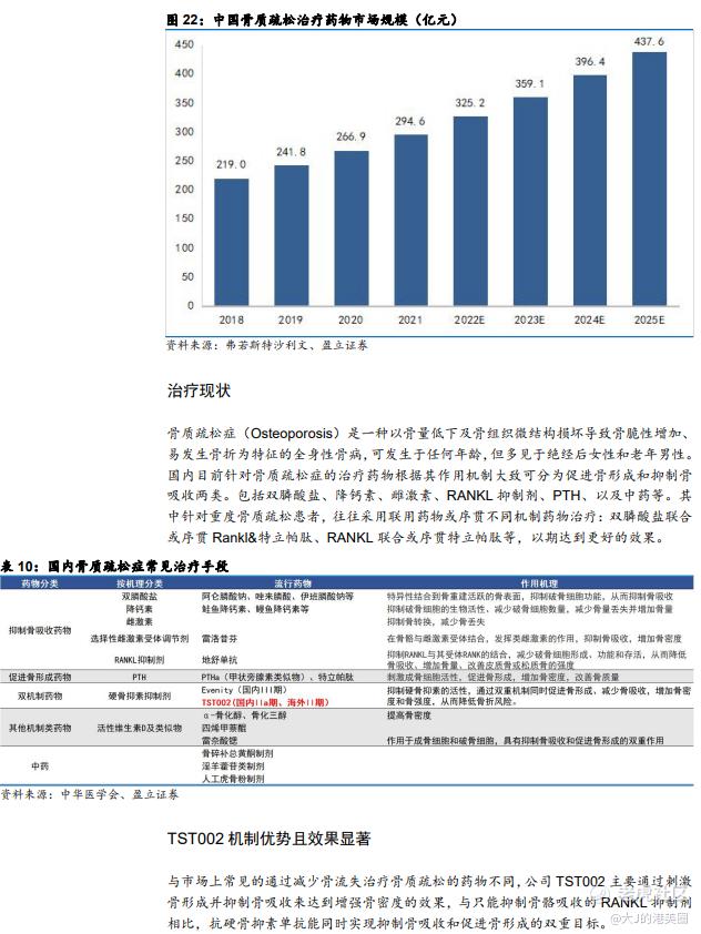 国内老龄化进一步加速,骨质疏松患者基数庞大,高危患者亟需更好的药物治疗。公司从国际知名巨头礼来公司引进全球第二款抗硬骨抑素产品TST002,相比安进同类首创药物Evenity拥有更好疗效和安全性。22年Evenity海外销售接近50亿人民币。面对国内骨质疏松巨大的临床未满足需求,公司有望凭借TST002打开一片蓝海市场。