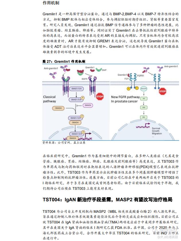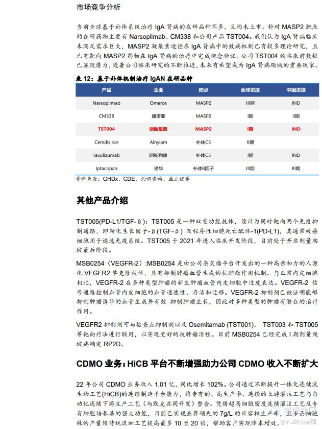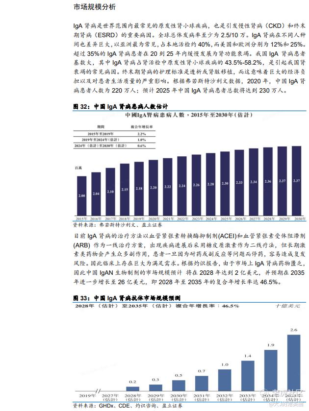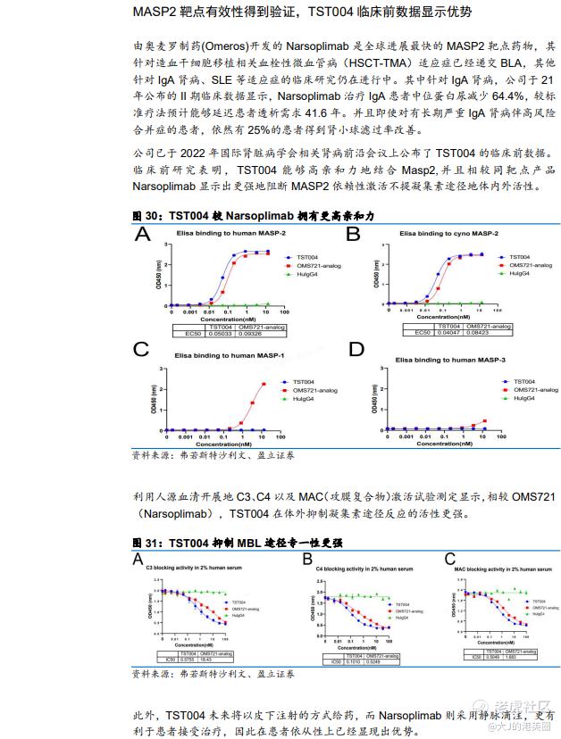 IgA肾病国内确诊患者超过10万,潜在患者群体高达200万以上,针对IgA肾病适应症,目前全球市场尚无创新药获批。主流糖皮质激素疗法效果有限且副作用大,公司MASP2靶点抗体药物TST004已在美获批临床,同类靶点竞争有限,未来有望重塑IgA肾病治疗格局。
