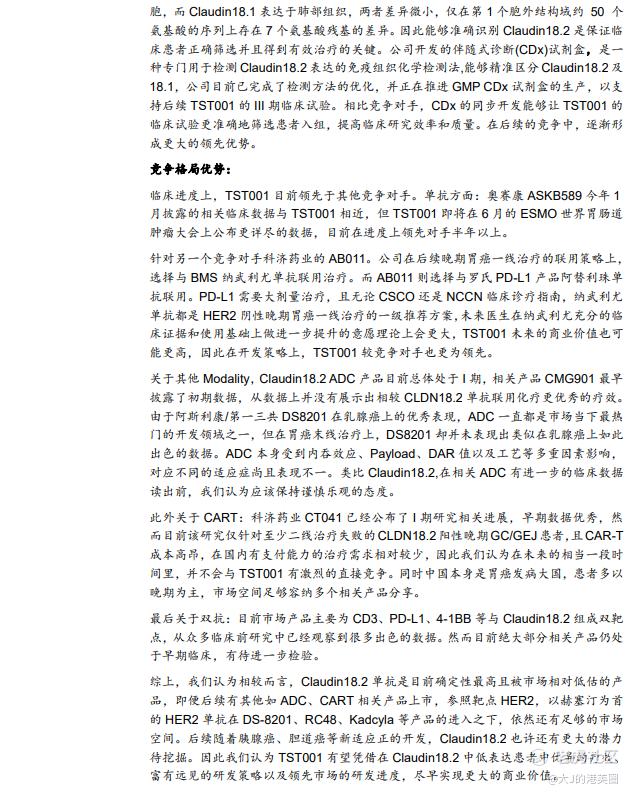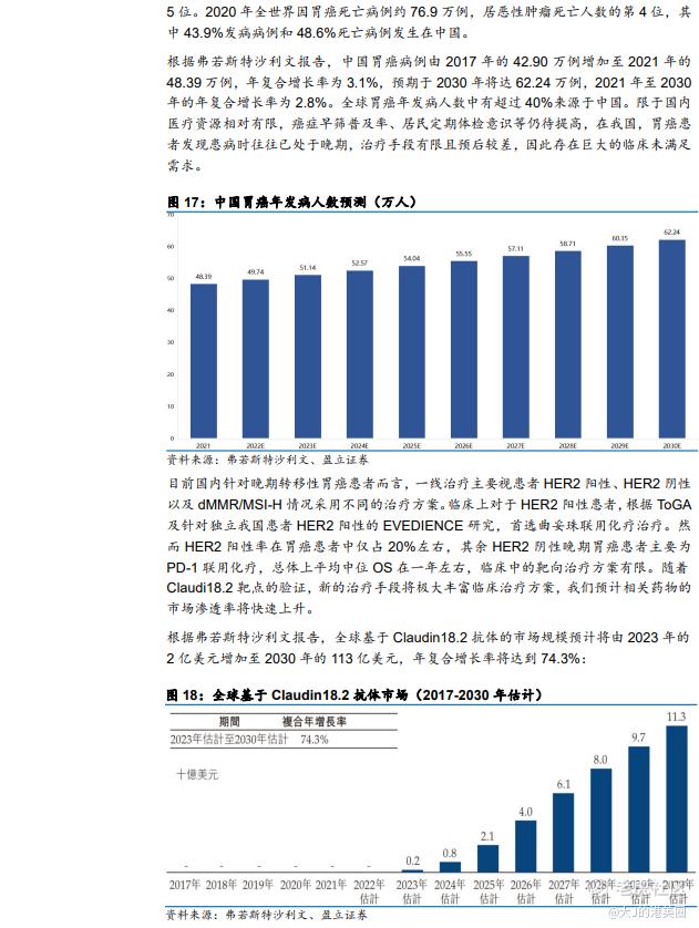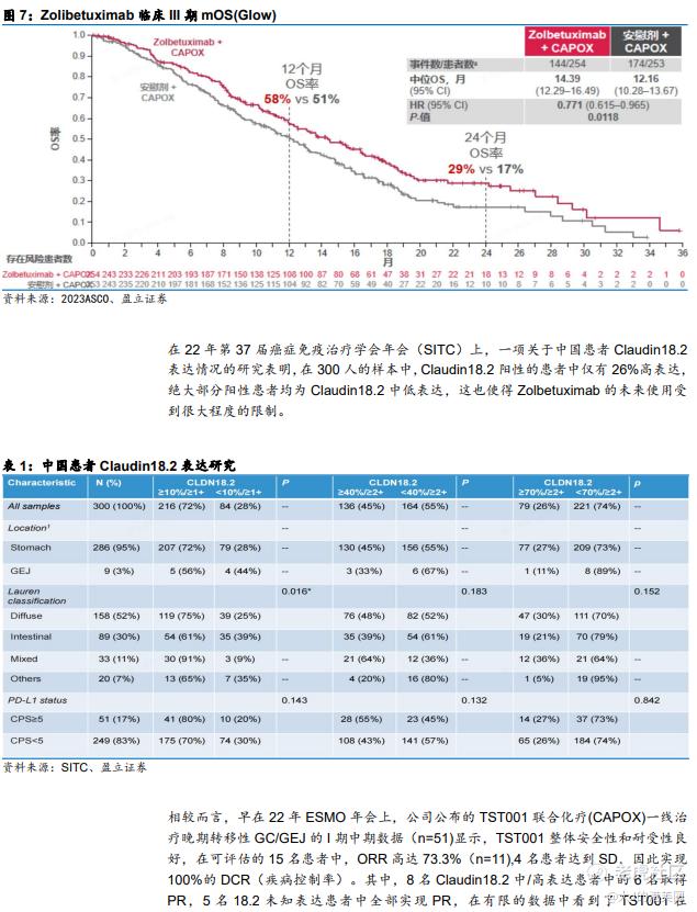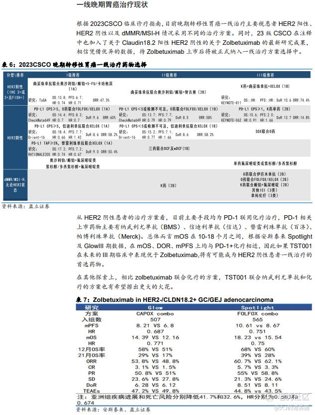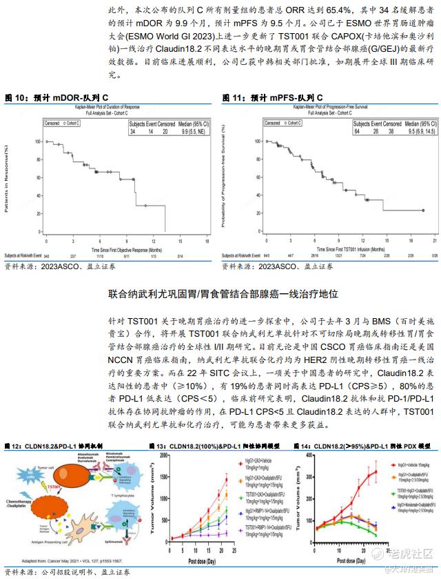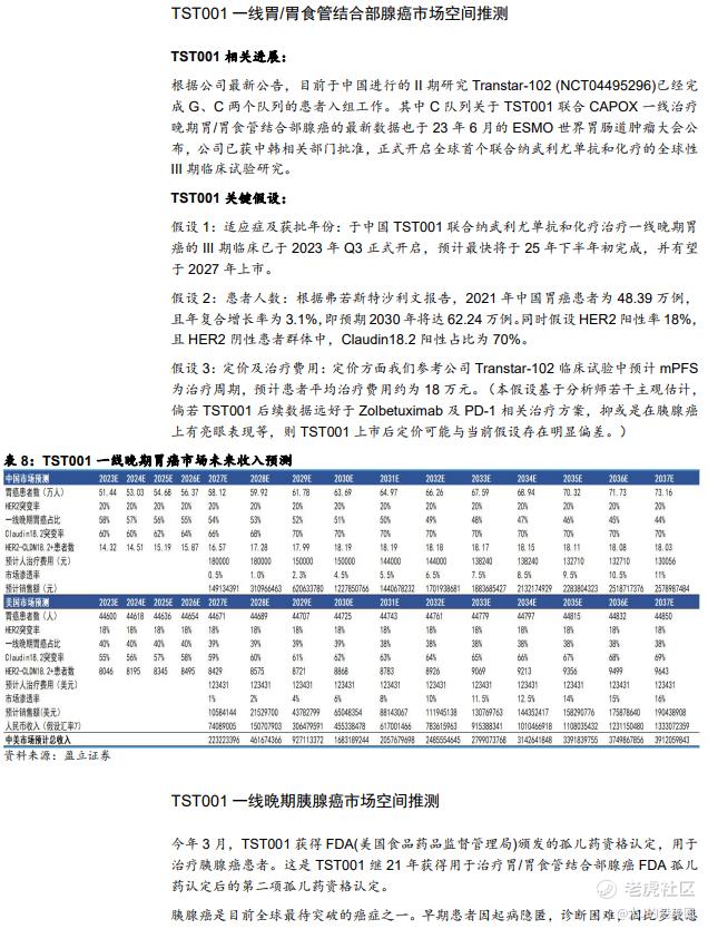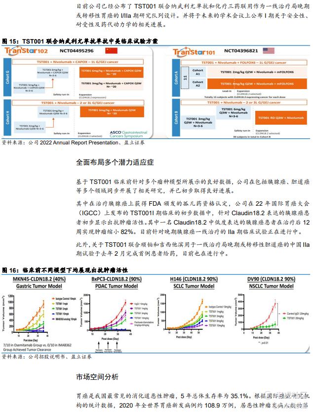 公司前瞻性布局TST001联合纳武利尤单抗及化疗的临床研究目前领先全球,2单抗联合PD-1及化疗的治疗方案有望成为未来一线晚期胃癌的重要治疗手段,并即将率先进入国际III期临床,加之TST001在Claudin18.2中低表达一线胃癌患者人群中也表现出了令人惊喜的疗效,TST001无疑将成为一线胃癌市场的王牌产品,斩获空白市场空间,商业化价值值得期待。