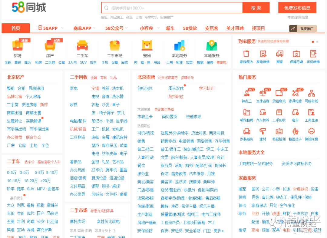 成立于2005年的58同城,业务覆盖招聘、房产、汽车、家政、二手交易等本地社区、信息分类服务。生意模式而言,靠撮合商家与用户达成交易收取推广费、会员服务费,做的是流量生意。