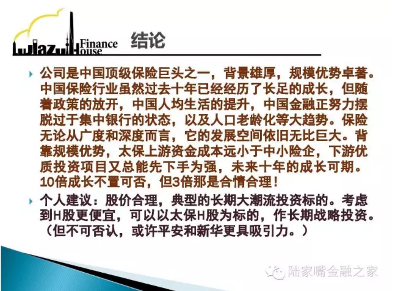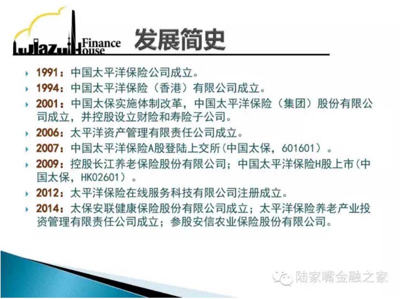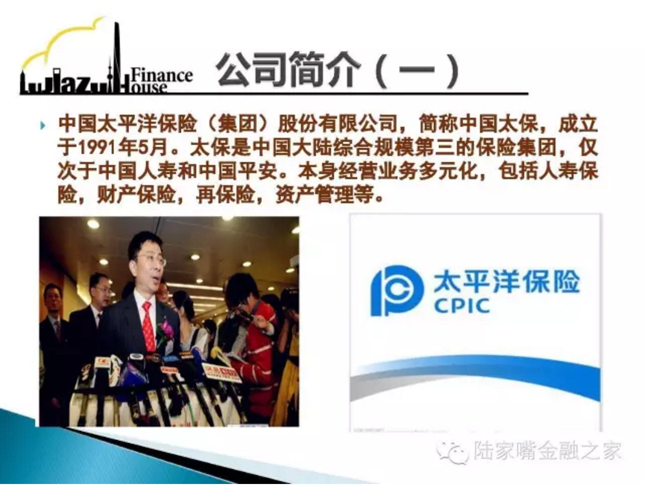 中国太保 $(601601)$全称中国太平洋保险(集团)股份有限公司,是中国大陆综合规模第三的保险集团。经营业务多样化,包括人寿保险、财产保险、再保险、资产管理等。