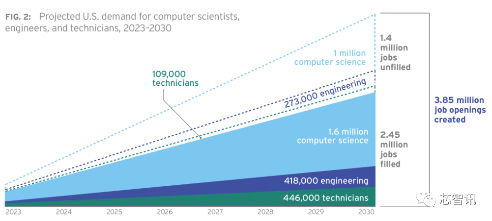 值得一提的是,该研究还认为,对于整个美国经济而言,到 2030 年底,预计美国将新增 385 万个需要精通技术领域的工作岗位,其中 140 万个工作岗位将面临空缺的风险,除非美国能够扩大该领域的此类工人的输送渠道例如熟练的技术人员、工程和计算机科学。