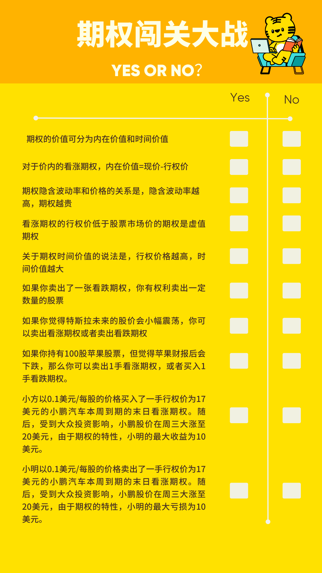 亲爱的虎友们,周末就要到啦!为了让大家的星期五更加不一样,今天我们特别准备了一场刺激的挑战:『期权闯关大战,YES OR NO』!这是一次测试你期权段位的绝佳机会!我们为你准备了十道充满挑战的问题,看看你能闯过多少关吧!