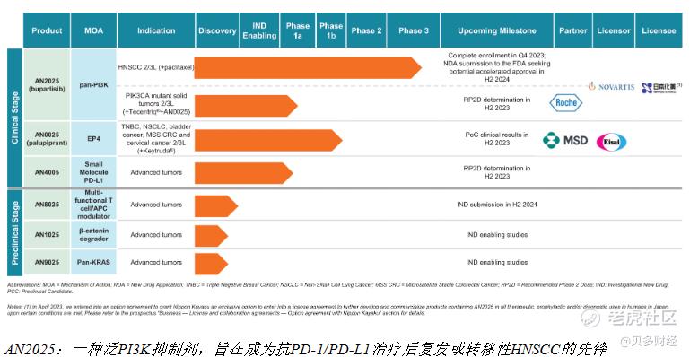 其中,AN2025(buparlisib)由诺华医药独家授权,已取得美国食品药品监督管理局的快速通道资格,或有期望成为治疗复发性或转移性头颈鳞癌的同类首创药物,正在开展全球多中心的III期临床试验。