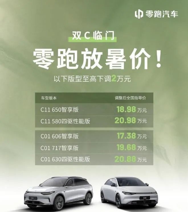 就在零跑四叶草架构发布的第二天(8月1日),零跑汽车官宣,对旗下C11纯电和C01部分车型售价进行调整,最高下调2万元。