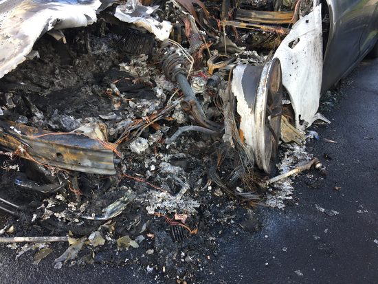 起火这个事情,很多人都很好奇是怎么回事。按道理说电池包中的每一个电池都是独立的,而且都被不可燃的冷却物所包裹,即使一个电池发热也会迅速把热量传送到冷却物中。所以,通常电池包一般是不会着火的。下图是一个Model S的电池组前半部分,可以看到虽然着火情况很严重,但火势并没有向深处蔓延,没有着到乘客舱下面。