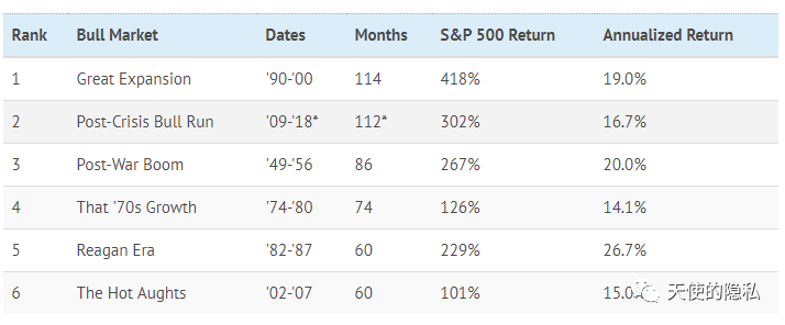 今天的文章我们先通过一张图表引入。这是自二战之后,美国股市最强劲的几个赚钱周期,从目前来看,标准普尔500指数在1990年11月至2000年3月的9年半(114个月)时间里,飙升了418%,年化收益19%,截止到今天,这个周期应该排名第1。