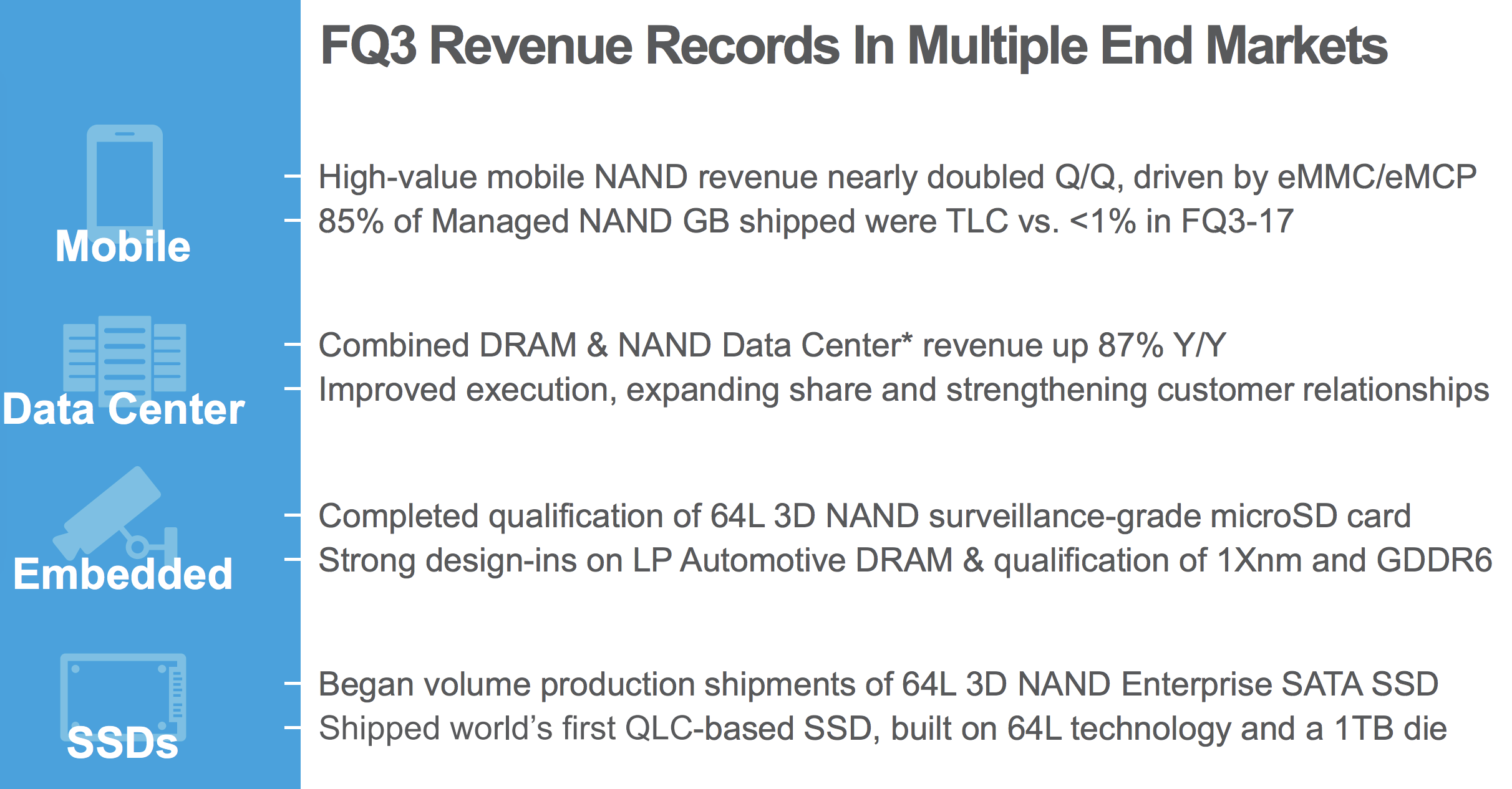 - 85%的Managed NAND出货是TLC NAND(说明成本优势非常大),而在FQ3-17的时候只占1%