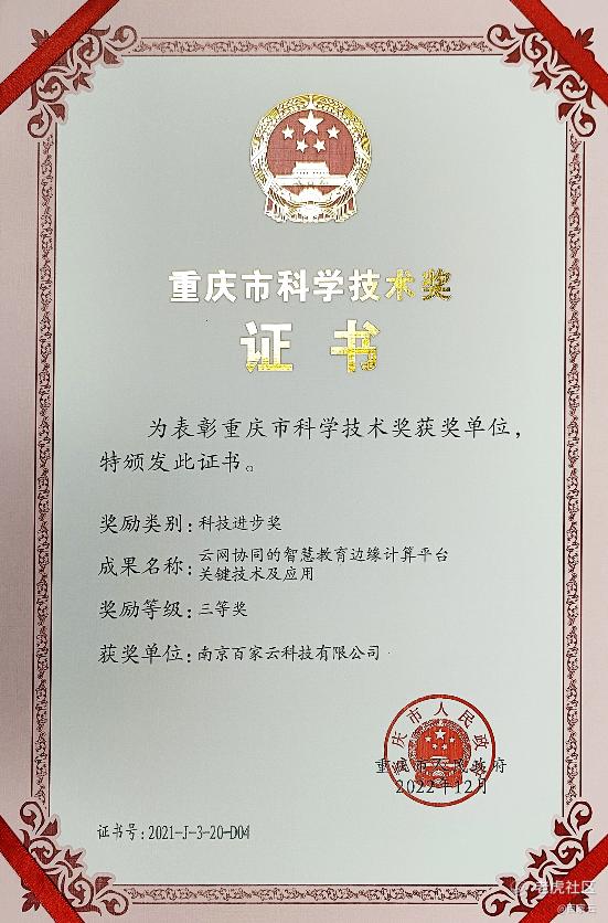百家云凭借自主研发的云网协同的智慧教育边缘计算平台,获得了评审组的高度认可,在评选中脱颖而出,荣获2022年重庆市科学技术奖三等奖。