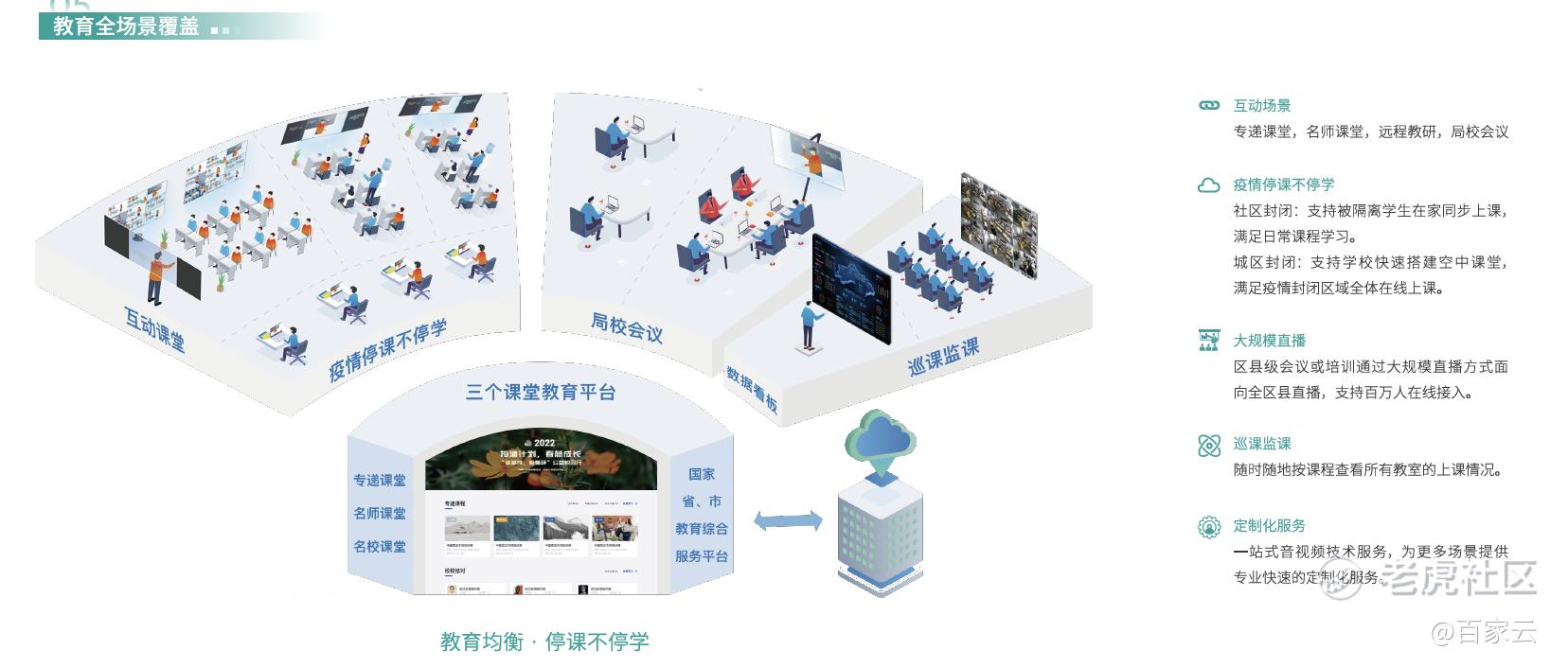 在教育行业数字化转型的浪潮下,百家云结合新一代智慧校园建设需求,通过多样的教学应用、前台和后台管理流程和坚实的技术底层服务,为智慧课堂构建了完整的服务生态。截至目前,百家云已在全国部署 1 万余间教室,为实现教、学、研、管、测的数字化转型提供助力。