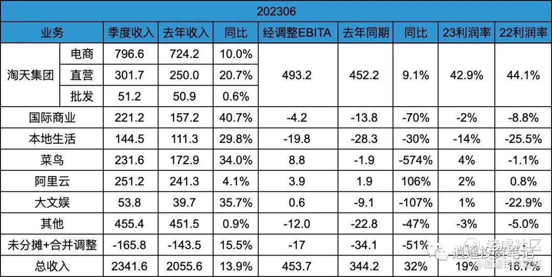 1、淘天集团之前和新零售(高鑫、盒马、银泰等)是放在中国商业板块下面,本季度开始分开,将新零售调整到其他业务。