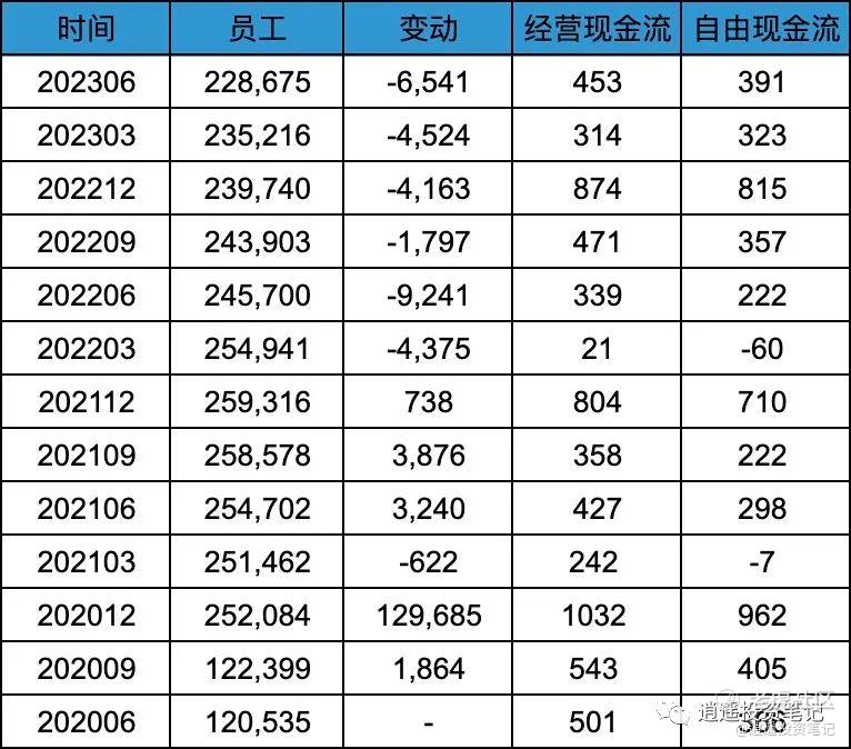 本季度员工数降低6541人,总员工数22.9万人,相对21年底的高点25.9万人,降低了3万人,降低比例12%。