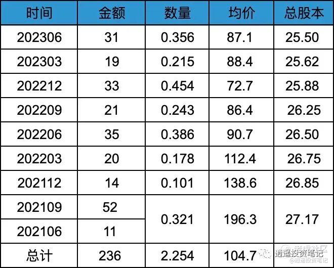 开启回购两年来,累计回购耗资236亿美金,累计回购2.25亿股,平均回购价104.7美金。