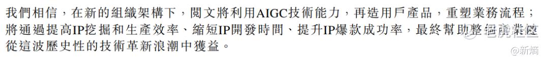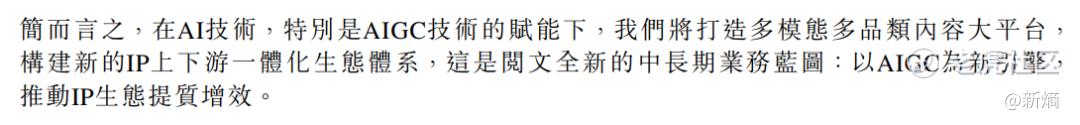 更深层次的改变是,阅文的底层驱动逻辑由原先内容IP驱动的阅文,升级为AI+IP双核驱动的阅文,面向于AIGC浪潮,阅文重新梳理和找准自己的定位。