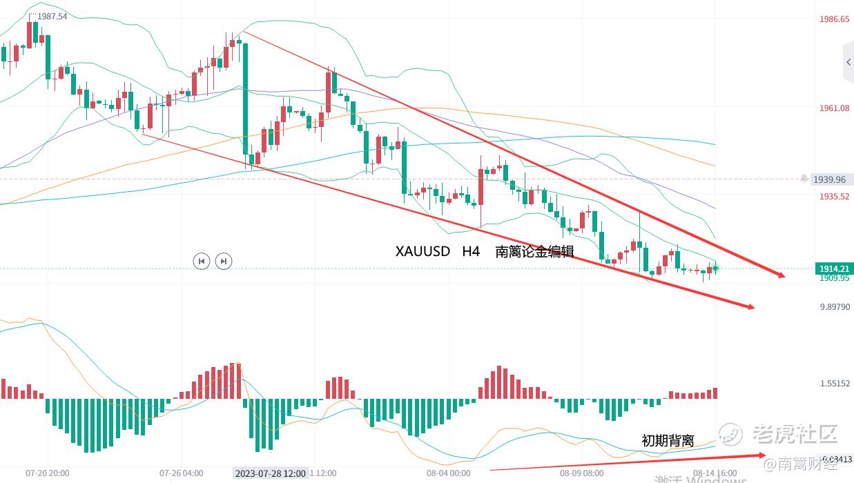 这么说,小周期带动大周期,大周期包涵小周期。黄金在低位已有一周左右,迟迟不去破位,是因为不喜欢吗?下方的前低、1902—1898这整个区间,就是此时空头的一道天堑。而趁着MACD的背离,恰好是为即将的破位带来积攒力量。