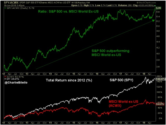 自从2012年,美国股市就一路狂飙,涨幅150%,大大超过全球除美国股市的55%:
