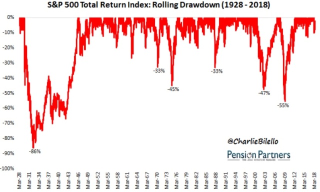 所以各种主动投资的基金经理,或投资顾问,可以根据客户喜欢轻易地把客户的钱全投资于标普500股市。可是,更负责任地更专业地,是要坚持多样化,并向客户耐心解释,多样化的重要性:保护未来的你,来免于像历史上的股市大崩盘造成的伤害: