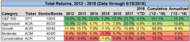 因为不管再怎么多样化投资组合,都赶不上美国股市的表现。下图的5行,从上到下分别是标普500,激进投资组合,增长型投资组合,平衡型投资组合,和保守型投资组合。可见没有一个投资组合类型可以赶上标普500大盘的回报: