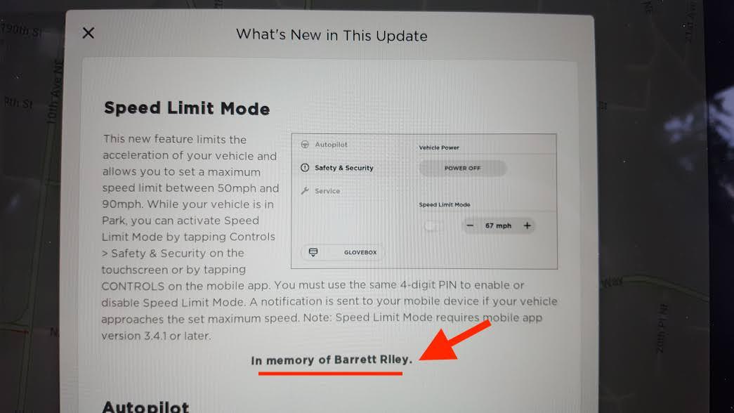 3、前几日我们报道的特斯拉推出的远程限速功能,有网友更新后在说明下面发现了这样一句话:“In memory of Barrett Ralley.”这个Ralley就是之前严重超速驾驶Model S导致两死以上的年轻人,那辆车是父亲送给他的礼物。