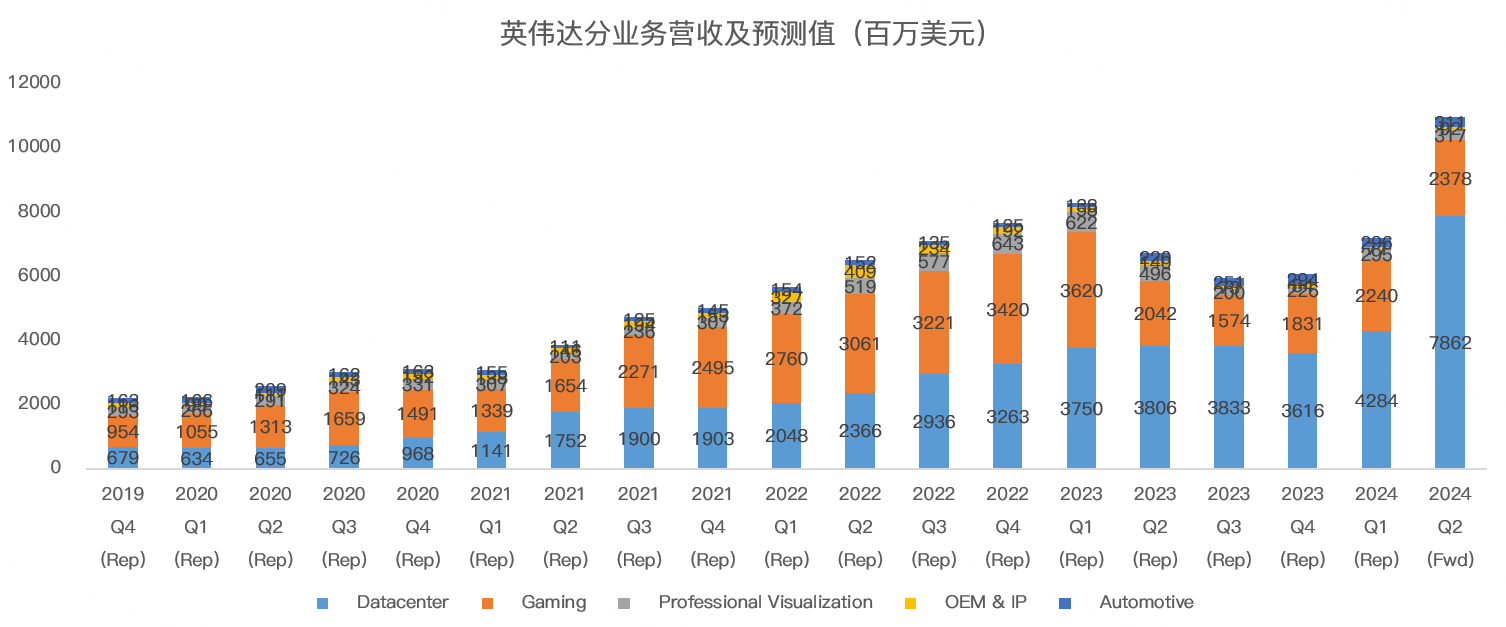 在上一季财报中,英伟达给世人带来惊艳,管理层预期FY24Q2营收在110亿美元左右,同比大增64%,远超分析师一致预期的71.5亿!