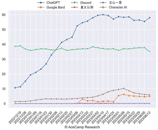 根据咨询服务机构AceCamp整理的数据,几乎所有的AI聊天机器人,在用户数量上的增长都已停滞,甚至开始出现下降趋势: