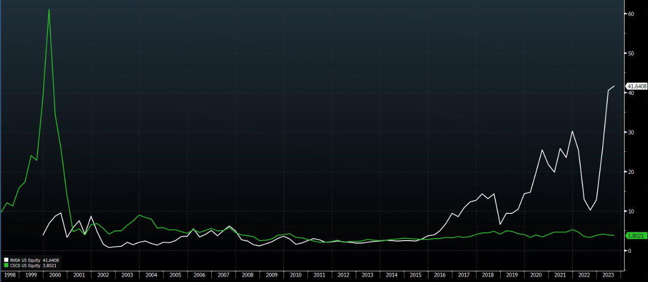 巨大的涨幅将英伟达的估值拉升至历史高位,于是乎,世人皆将英伟达与互联网泡沫时期的思科对比,试图论证AI泡沫巨大!