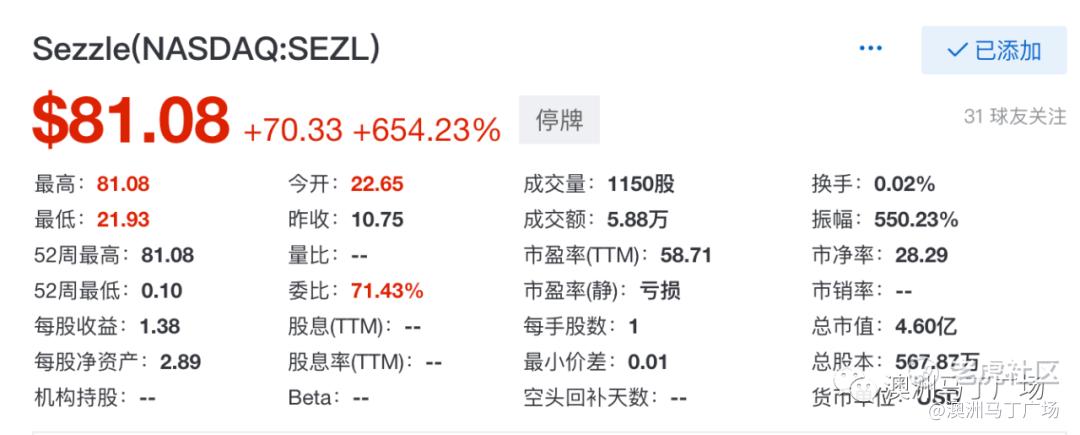 截止今日收盘,Sezzle股价为81.08美元,市值为4.6亿美元。