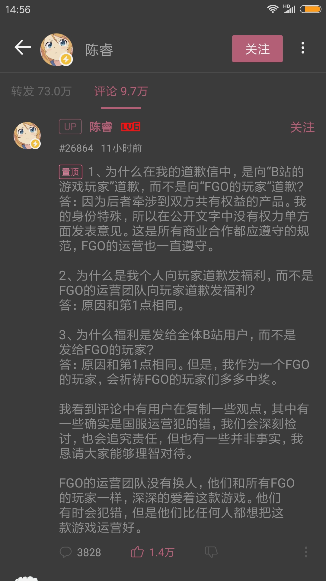 $哔哩哔哩(BILI)$ 大概就是游戏运营不善,惹怒玩家,老总出来帮忙擦屁股。毕竟fgo占b站总收入大半江山,这一动荡影响不小。做多的且行且珍惜
