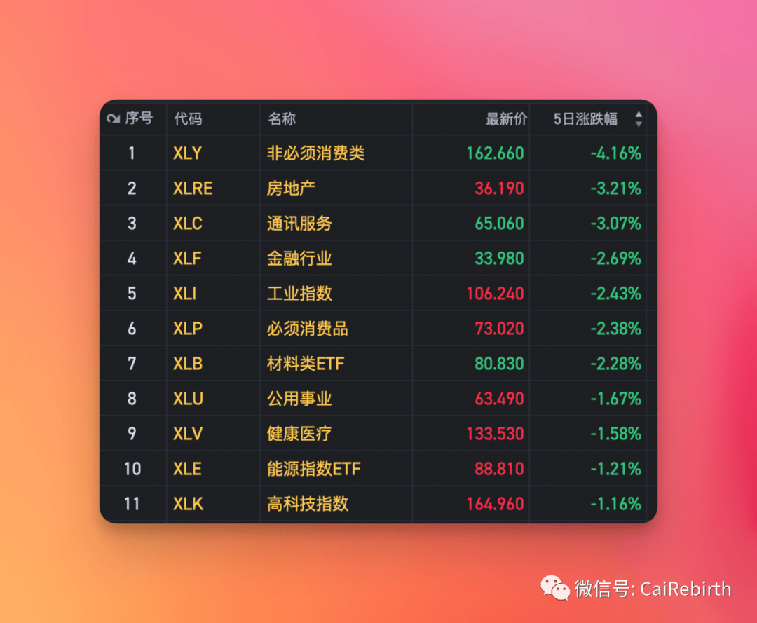 本周 11 大板块全部下跌,这次连 XLE 能源都跌了。