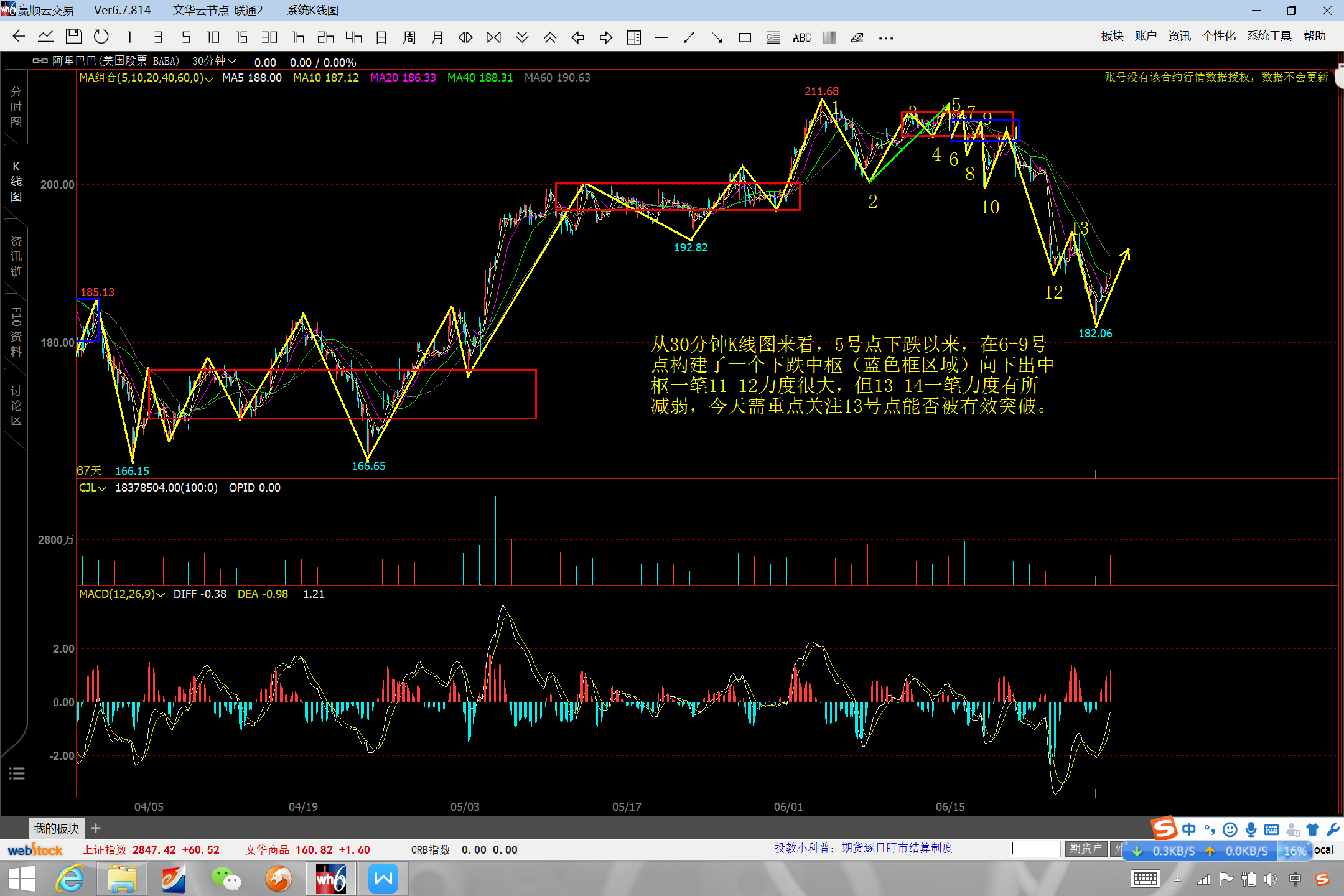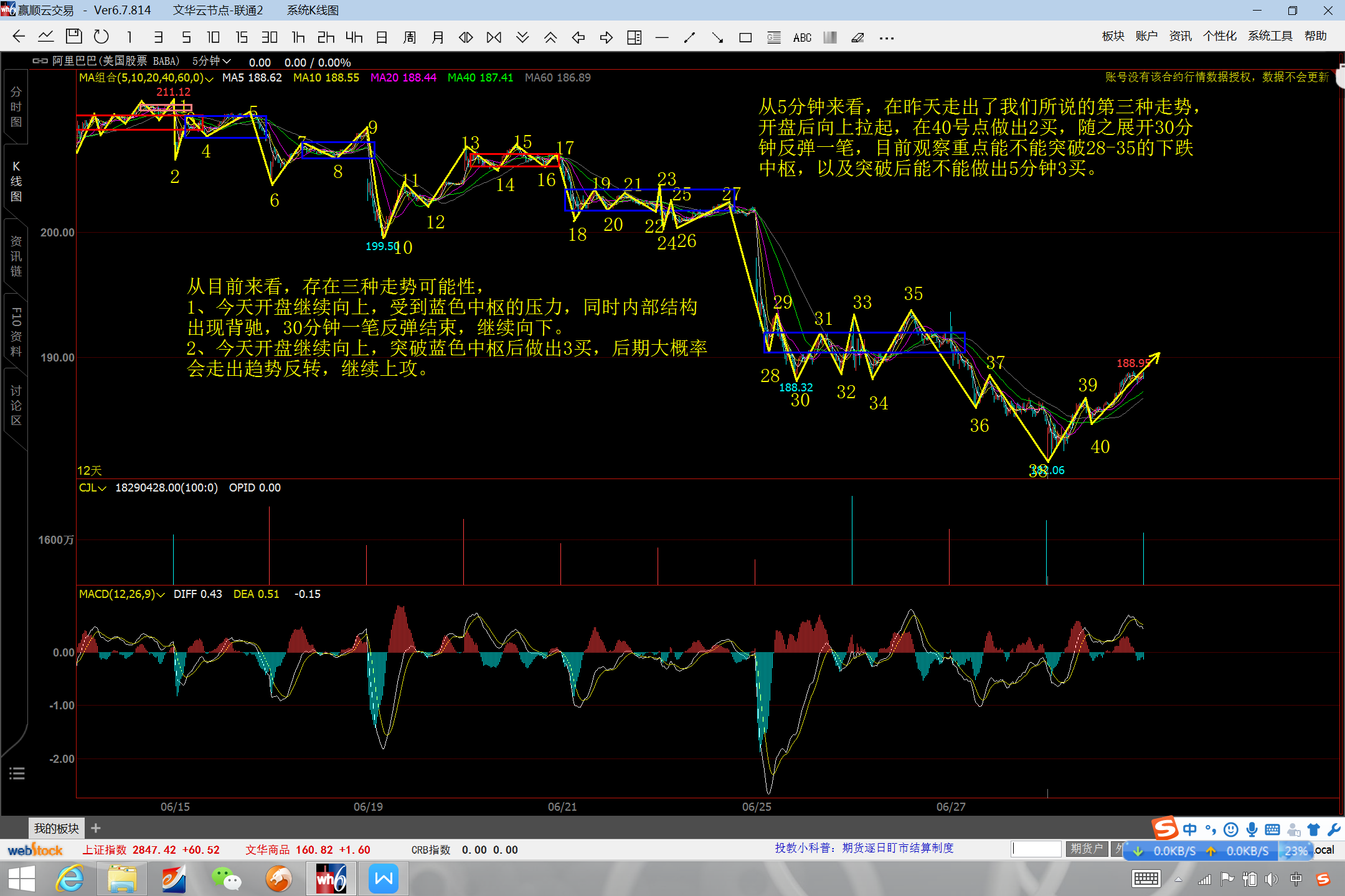 $(BABA)$ 目前处于30分钟反弹一笔,在这个地方是走出反转还是做个30分钟下跌中枢再继续下跌,主要看能否出现针对最后一个5分钟下跌中枢的3买。