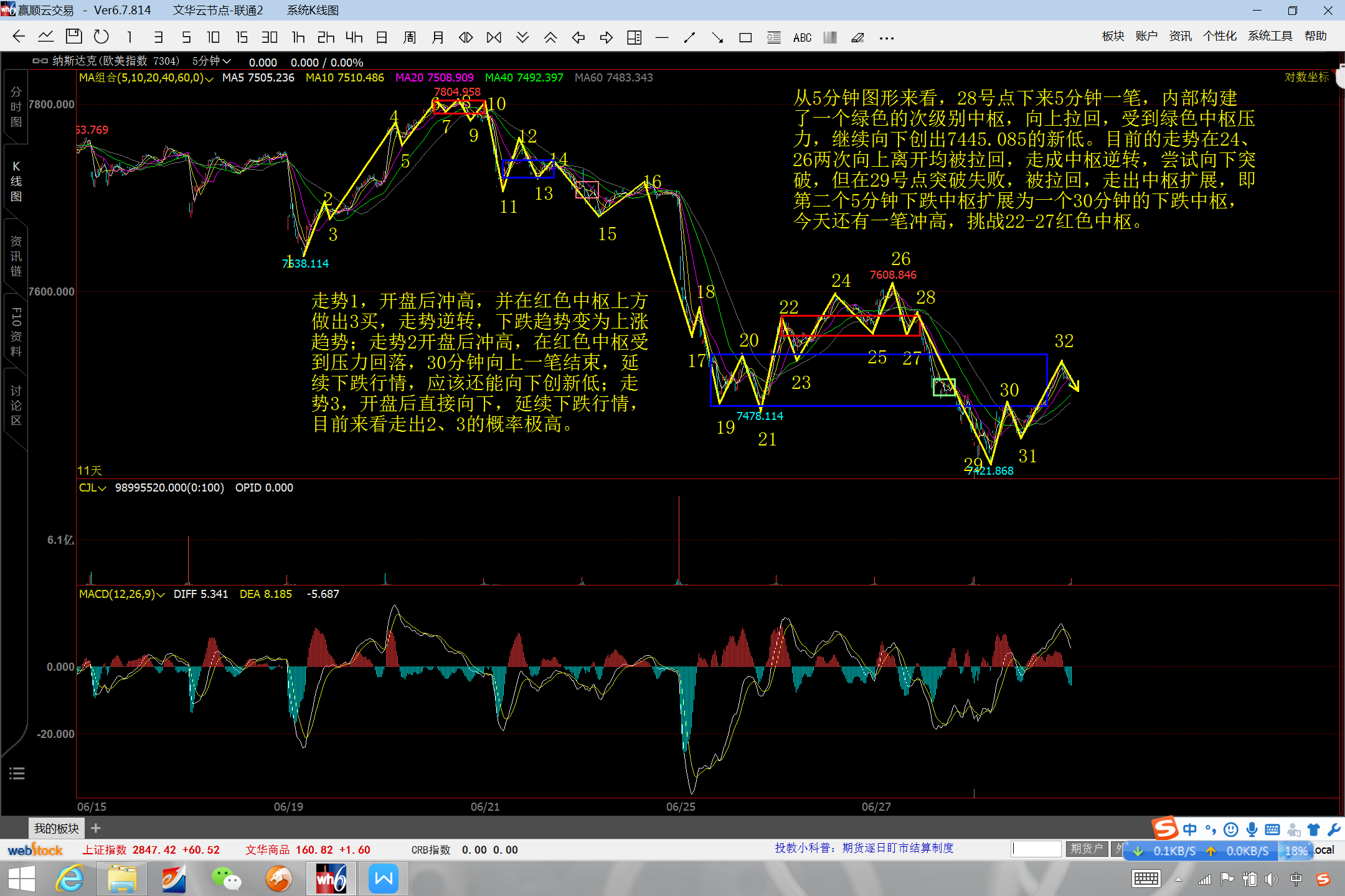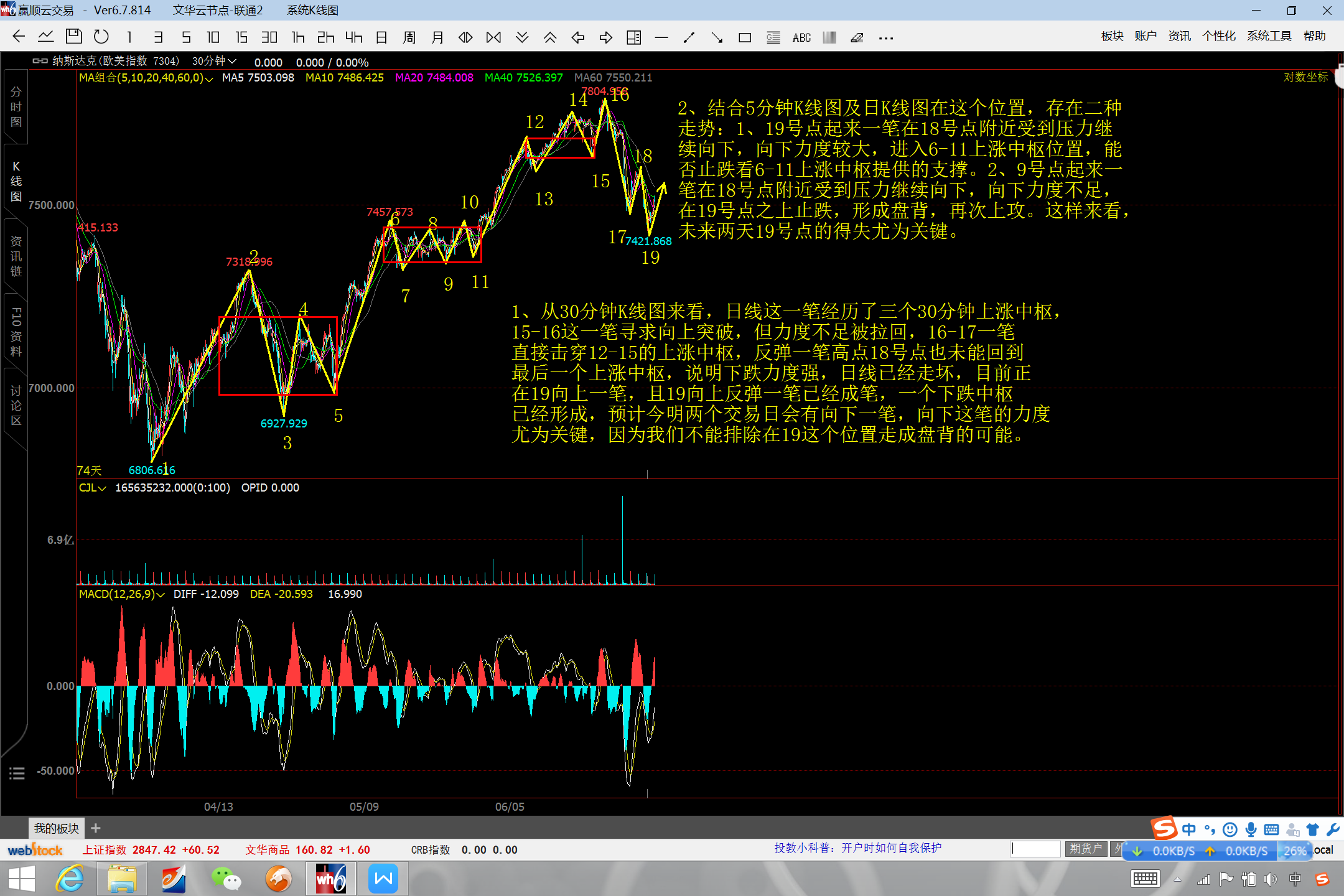$纳斯达克(.IXIC)$ 纳指目前处于中枢扩展阶段,有走强的可能性,但更多的应该是警惕多头陷阱,在5分钟3买出来前,不应盲目做多。
