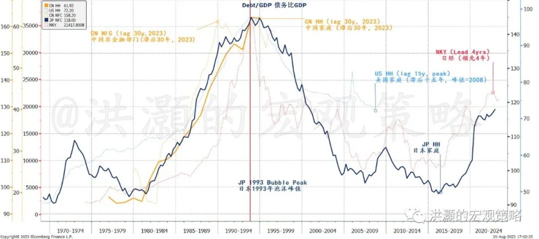 我们数据分析了1993年日本泡沫顶峰时与中国2023年的家庭/私人债务占GDP比率(图表 3)。数据图表显示,中国私人部门的负债比率现在约为GDP的150%,与1993年日本房地产泡沫的顶峰的水平相似。此外,中国私人部门加杠杆的速度与日本当年的情况也惊人地相似。