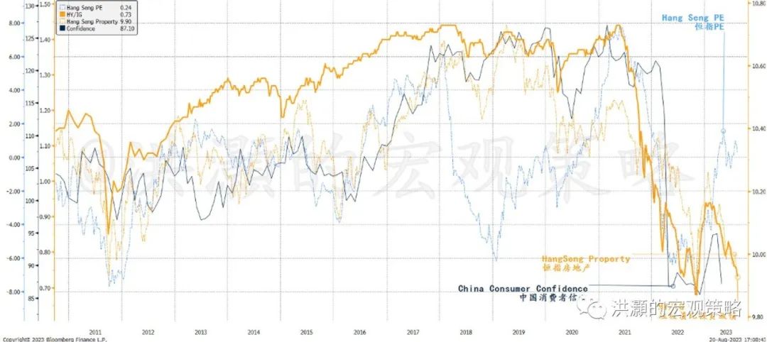 虽然之前的讨论提出了一些非共识的观察,但房地产行业依然面临着严峻的挑战。在图表 2中,我们可以看到,虽然房地产行业的估值有所修复,但房地产高收益率美元债券相对于投资级债券的表现似乎在向次低点运行,这种走势与中国消费者信心和房地产行业指数相一致。